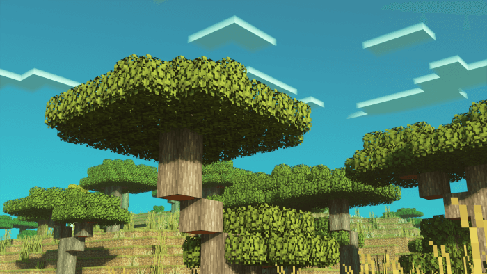 Листья: Текстуры листьев становятся более плотными и густыми благодаря внедрению 3D моделей и более круглых форм. Это создает ощущение более объемных и пышных лесов, делая природную часть мира Minecraft более живописной и реалистичной.